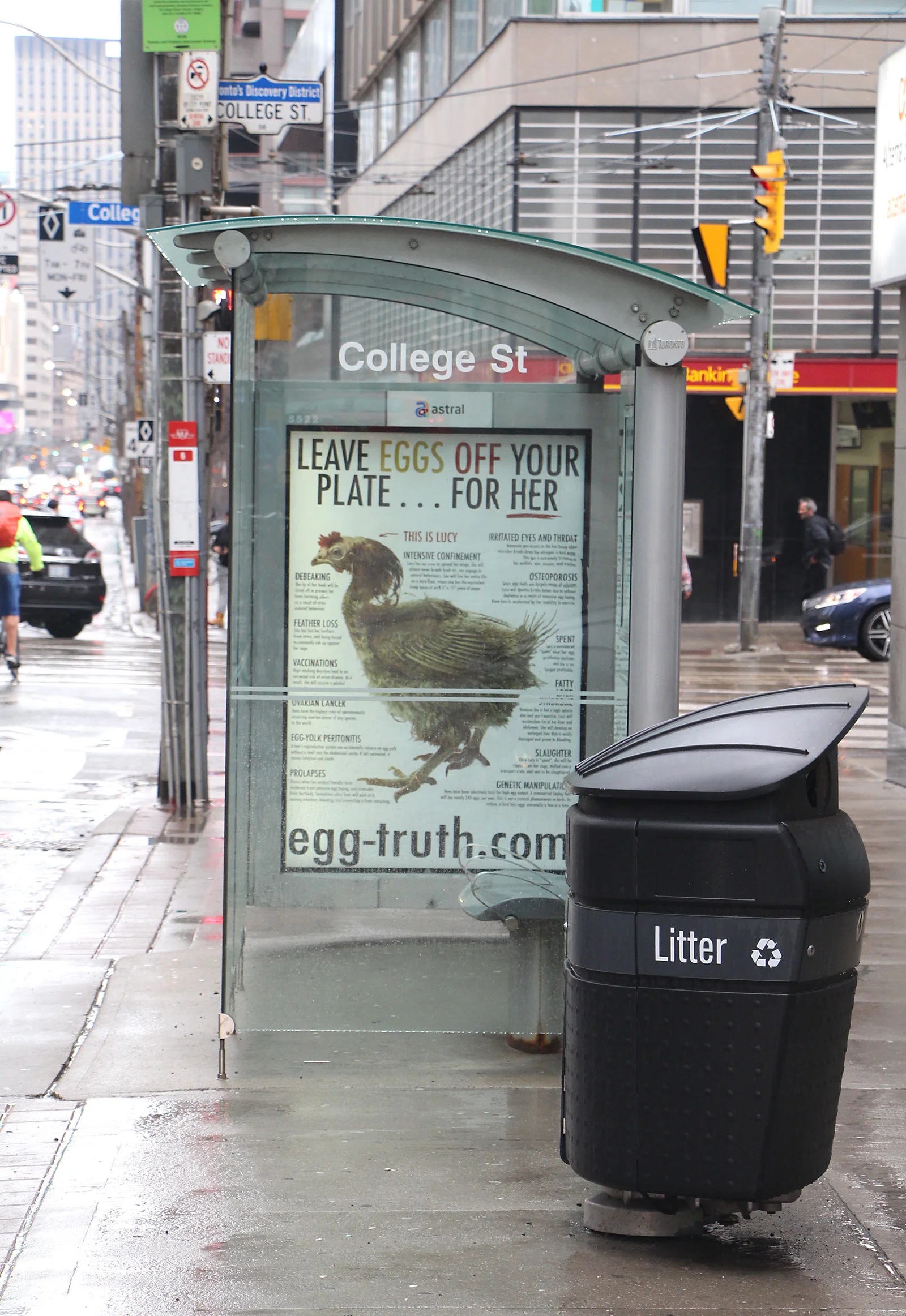 We have placed 42 transit shelter posters in key locations throughout the city of Toronto - North America’s fourth largest urban centre. There are two versions of the creative. The first one (seen in the mock-up above) is for exterior faces where sight-lines are long and read times are short. The other creative is for interior faces only and contains a multitude of descriptions about the many illnesses and conditions hens forced to lay eggs endure. The central image is of a “spent” hen whom we’ve called “Lucy”. Lucy is representative of the millions of hens condemned to lay eggs in barns all over the world. Our campaign is using the hashtag #thisislucy.